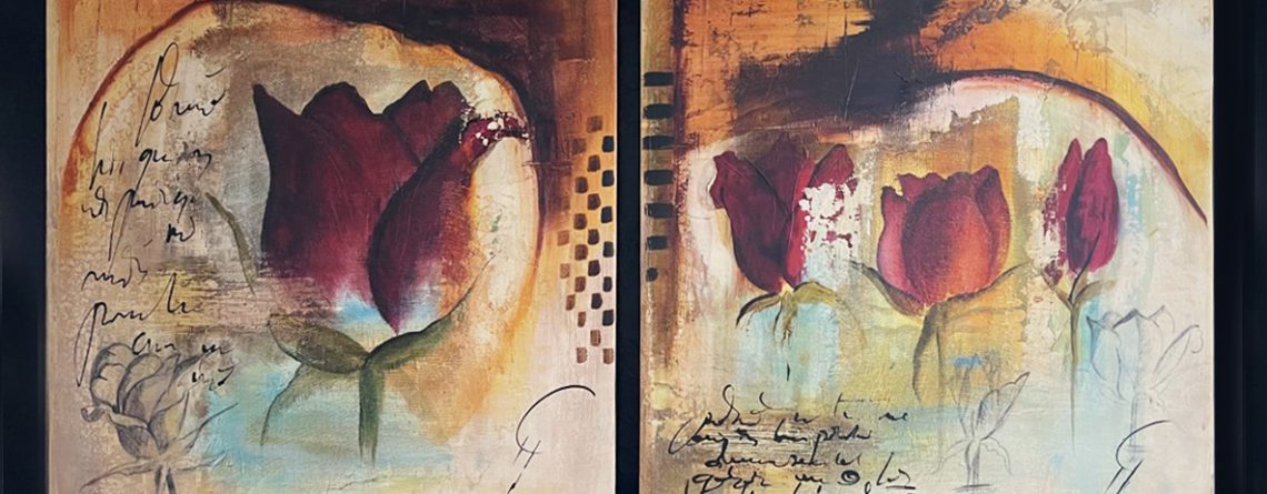 Λουλούδια - Δίπτυχο αντίγραφο έργο τέχνης της Gemma Leys. Καμβάς χειροποίητος με χειροποίητη πλάτη. Διάσταση έργου: 68 x 68 εκ. (έκαστο κομμάτι) Διάσταση πλάτης: 158 x 89 εκ.
