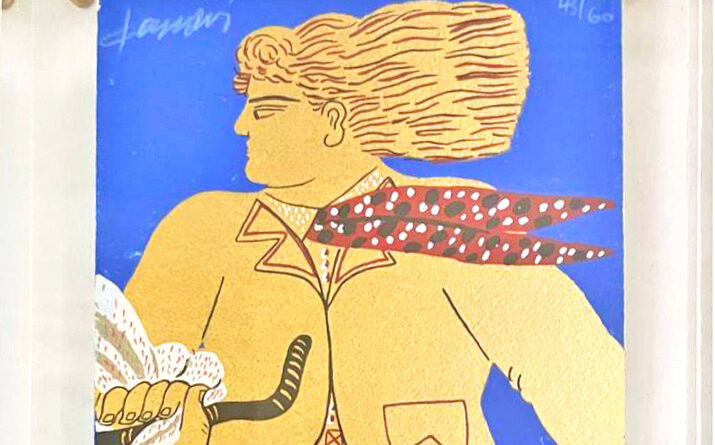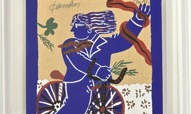 "Blue cyclist" - Collectible silkscreen, signed and numbered by Alekos Fassianos. Comes with a certificate of authenticity. Dimensions: 44 x 63 cm Frame dimensions: 71,5 x 89 cm. LAST ONE AVAILABLE The frame includes anti-reflective UV glass, which is invisible, illuminates and highlights the colors of the project and offers up to 70% protection from UV rays.