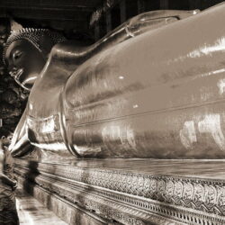 Praying the reclined Buddha, Wat Pho, Bangkok, Thailand (sepia)