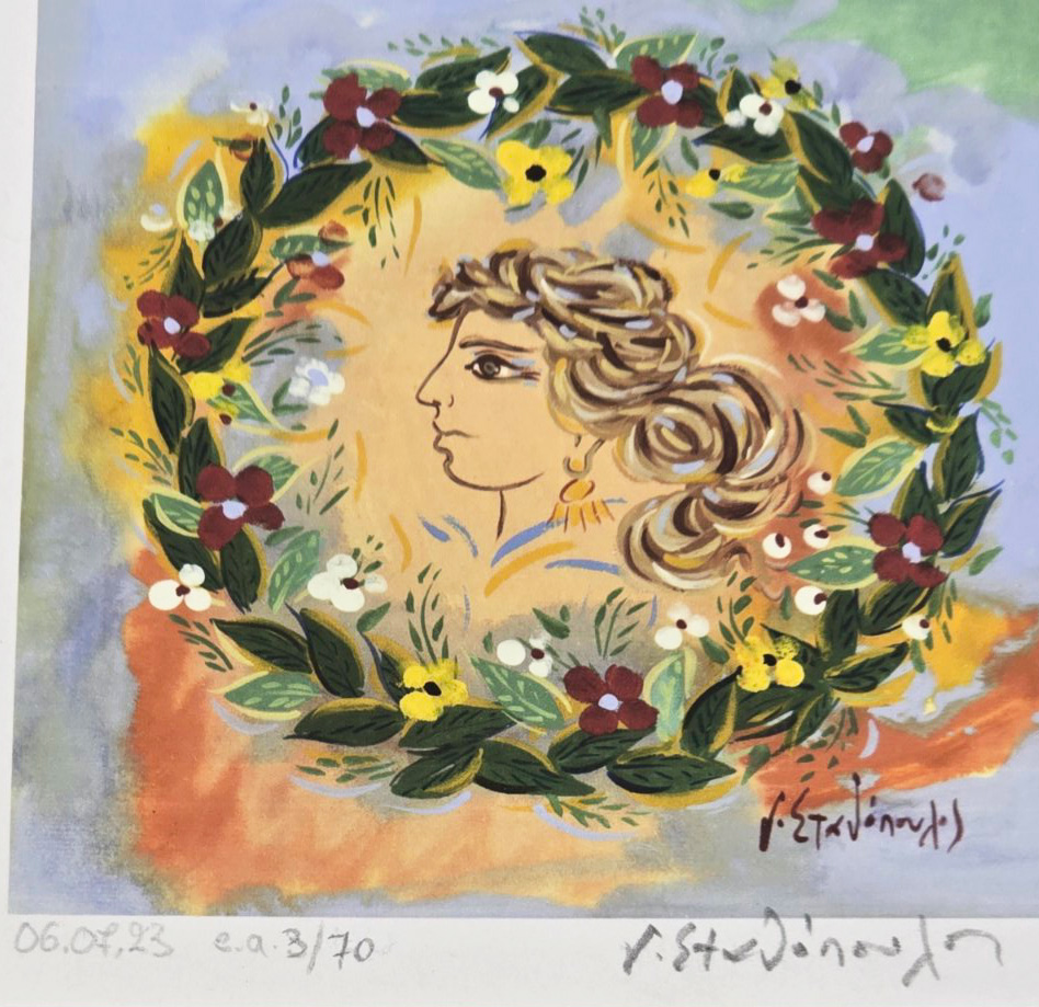 “Κοπέλα με άνθη II” – Συλλεκτική μεταξοτυπία υπογεγραμμένη και αριθμημένη από τον Γιώργο Σταθόπουλο.